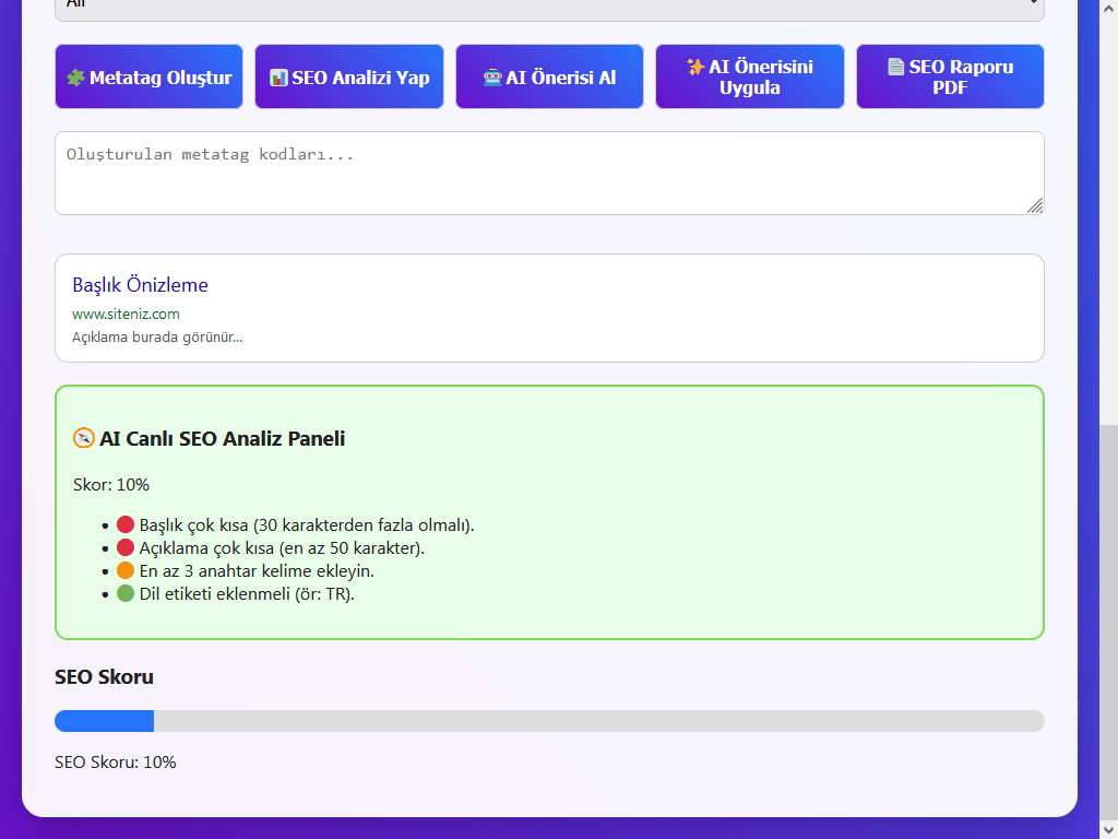 AI destekli öneriler sayesinde, metatag’larınız daha etkili ve modern SEO kurallarına uygun olarak hazırlanır.