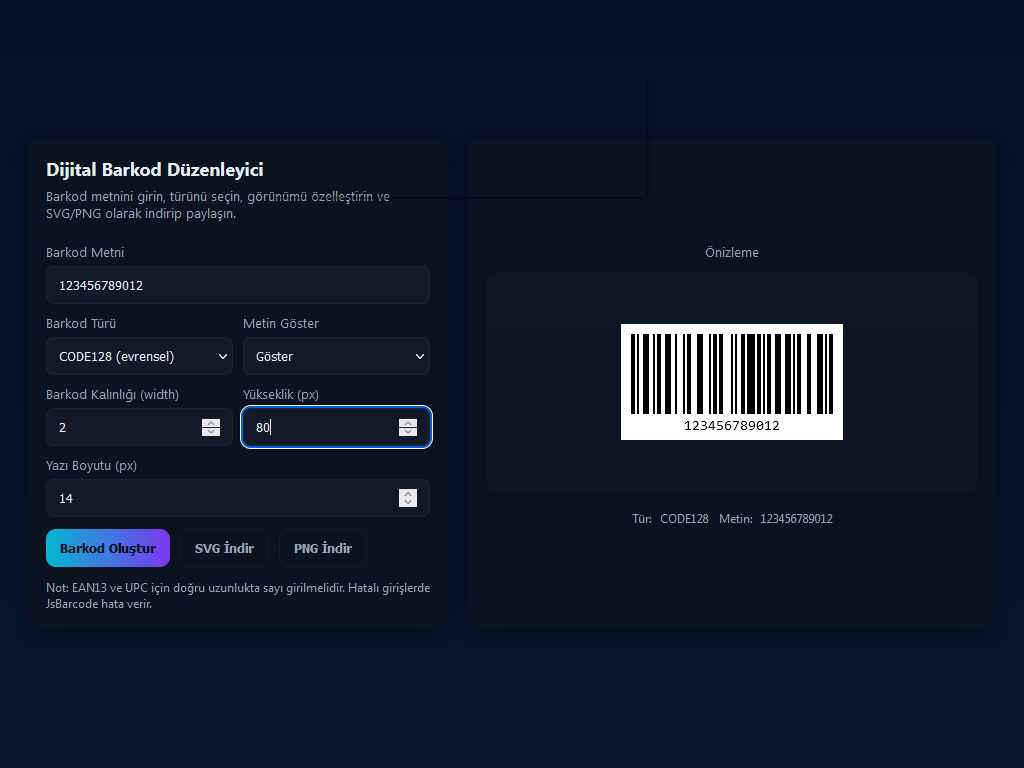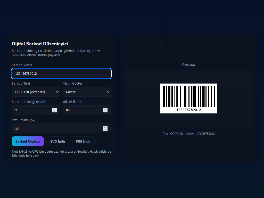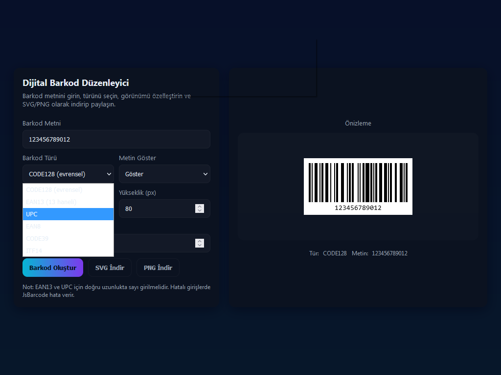 Desteklenen barkod formatları: (örn. EAN-13, UPC, QR, Code128, vs.)
