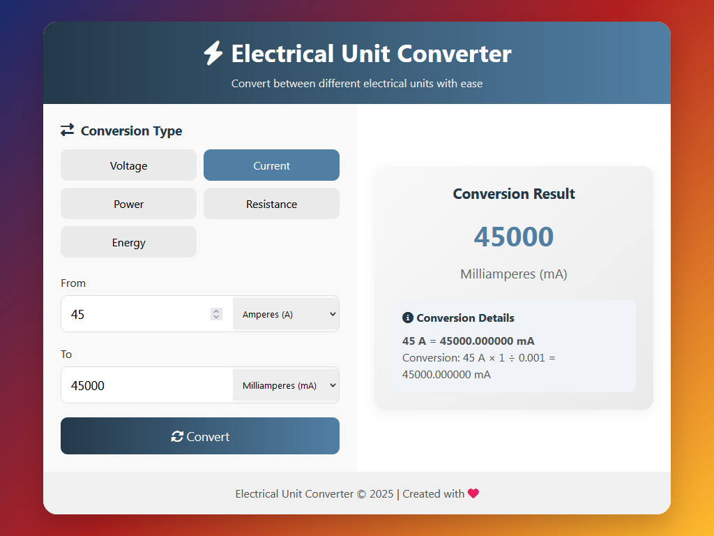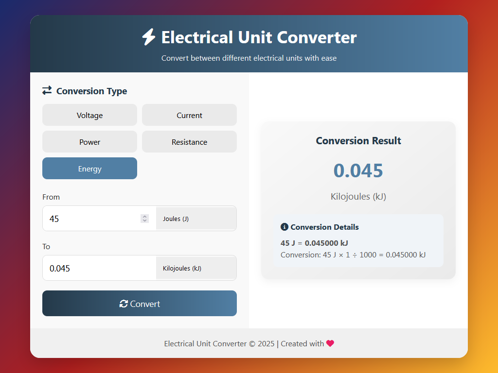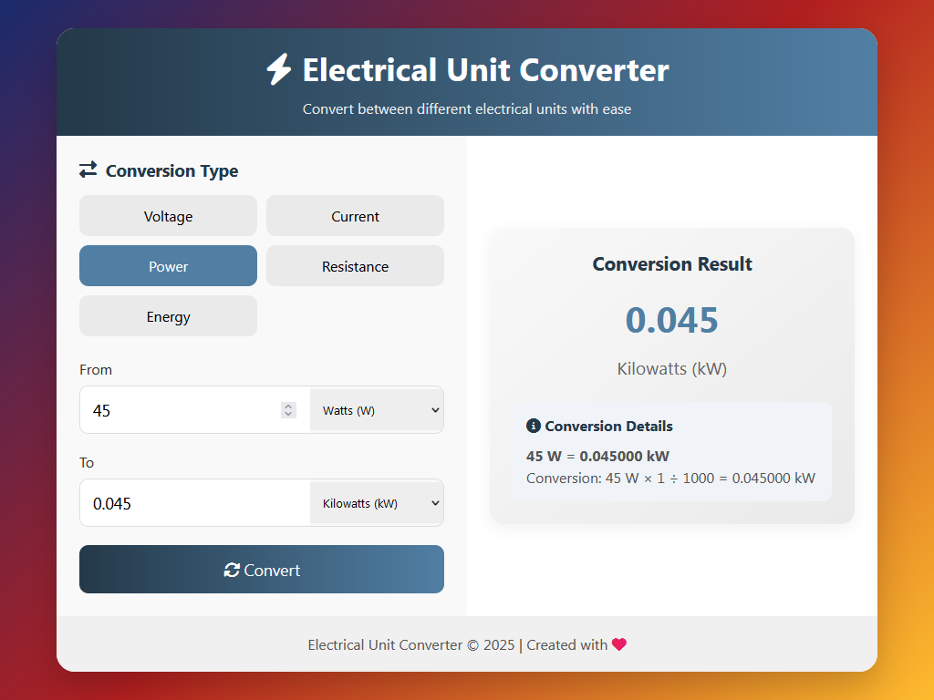 Elektriksel Birim Dönüştürücü, mühendisler, teknikerler, öğrenciler ve elektrikle ilgili çalışan tüm profesyoneller için geliştirilmiş web tabanlı bir araçtır. Farklı elektriksel birimler arasında hızlı, güvenilir ve doğru çevirimler yapmanızı sağlar.
